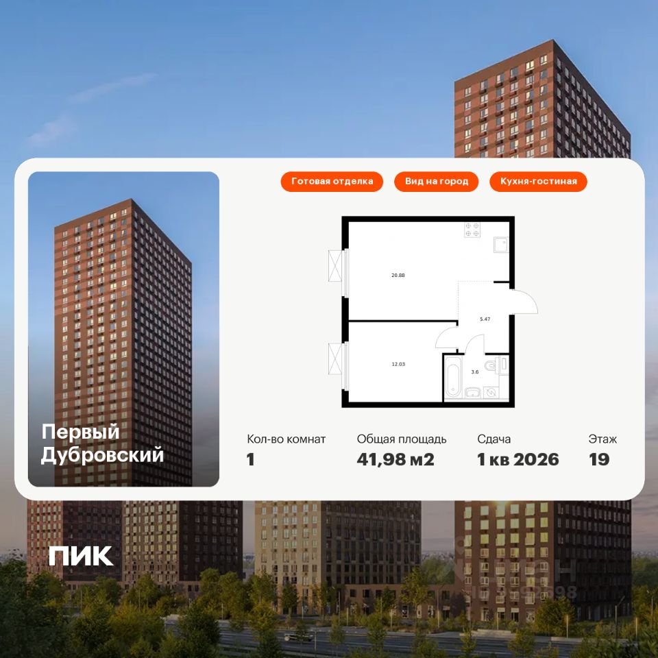 Продаётся 1-комн. квартира площадью 41,98 кв.м на 19 этаже 33 этажного дома (Корпус 1.3, Секция 1) проекта ПИК Первый Дубровский. Светлый просторный подъезд на уровне земли, функциональная планировка, большие окна, c отделкой.