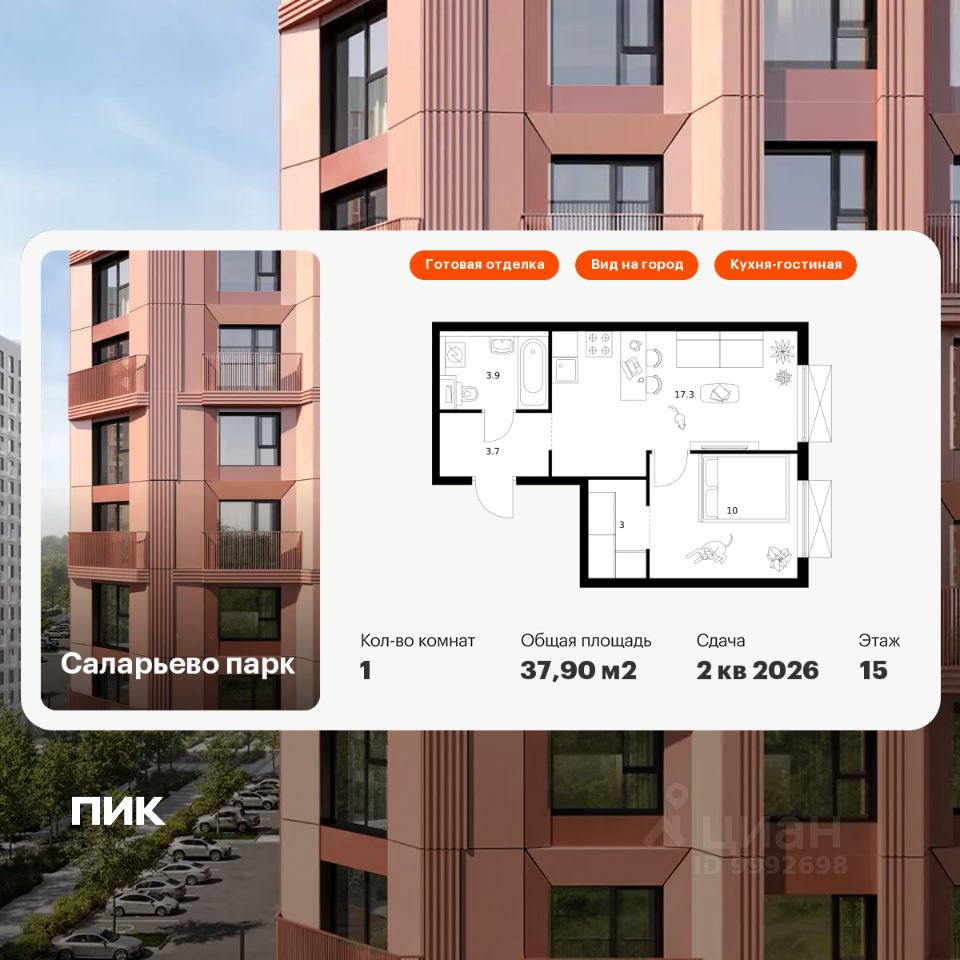 Продаётся 1-комн. квартира площадью 37,9 кв.м на 15 этаже 16 этажного дома (Корпус 20, Секция 2) проекта ПИК Саларьево парк. Светлый просторный подъезд на уровне земли, функциональная планировка, большие окна, c отделкой.