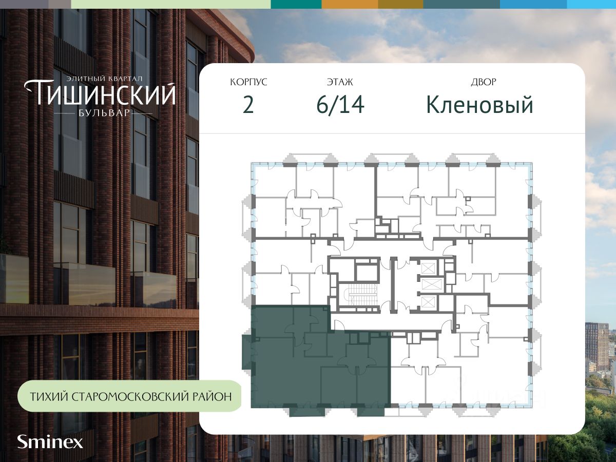 "Тишинский бульвар" - тихий зелёный элитный квартал на Тишинке, в престижном и комфортном районе центра Москвы. В нём создан уникальный для элитного дома прогулочный бульвар в своём огромном парке 1,9 га. В парке оборудованы зоны для активного и тихого отдыха, крытые галереи, приватные зелёные комнаты, многофункциональная спортивная площадка, воркаут-зона, детская площадка, сухой фонтан, ручей.