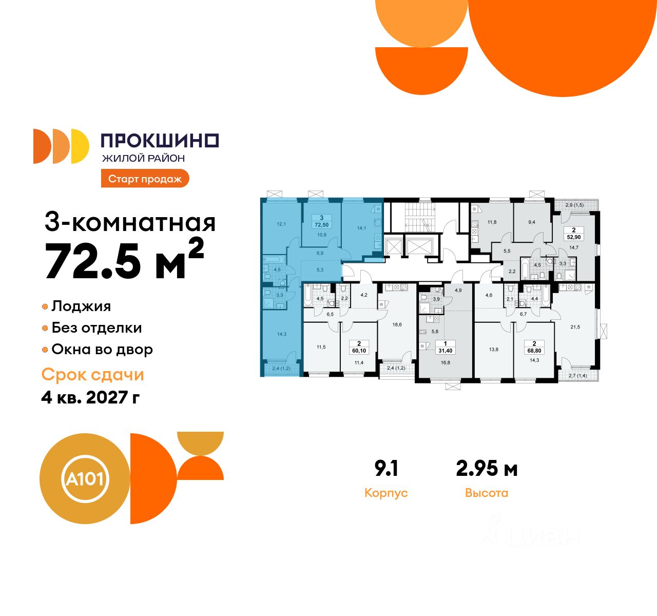 Продается трехкомнатная квартира 20 в новостройке Жилой квартал "Прокшино" по адресу Москва, ТиНАО, Новомосковский АО, Сосенское С/П, пос. Коммунарка. Общая площадь квартиры - 72.50 кв. м., этаж 6 из 13, секция 1. Тип проекта, по которому построен дом - монолит, компания-застройщик - ООО "А101". Стоимость квартиры - 27695000 Р. Срок сдачи - 4 квартал 2027.
