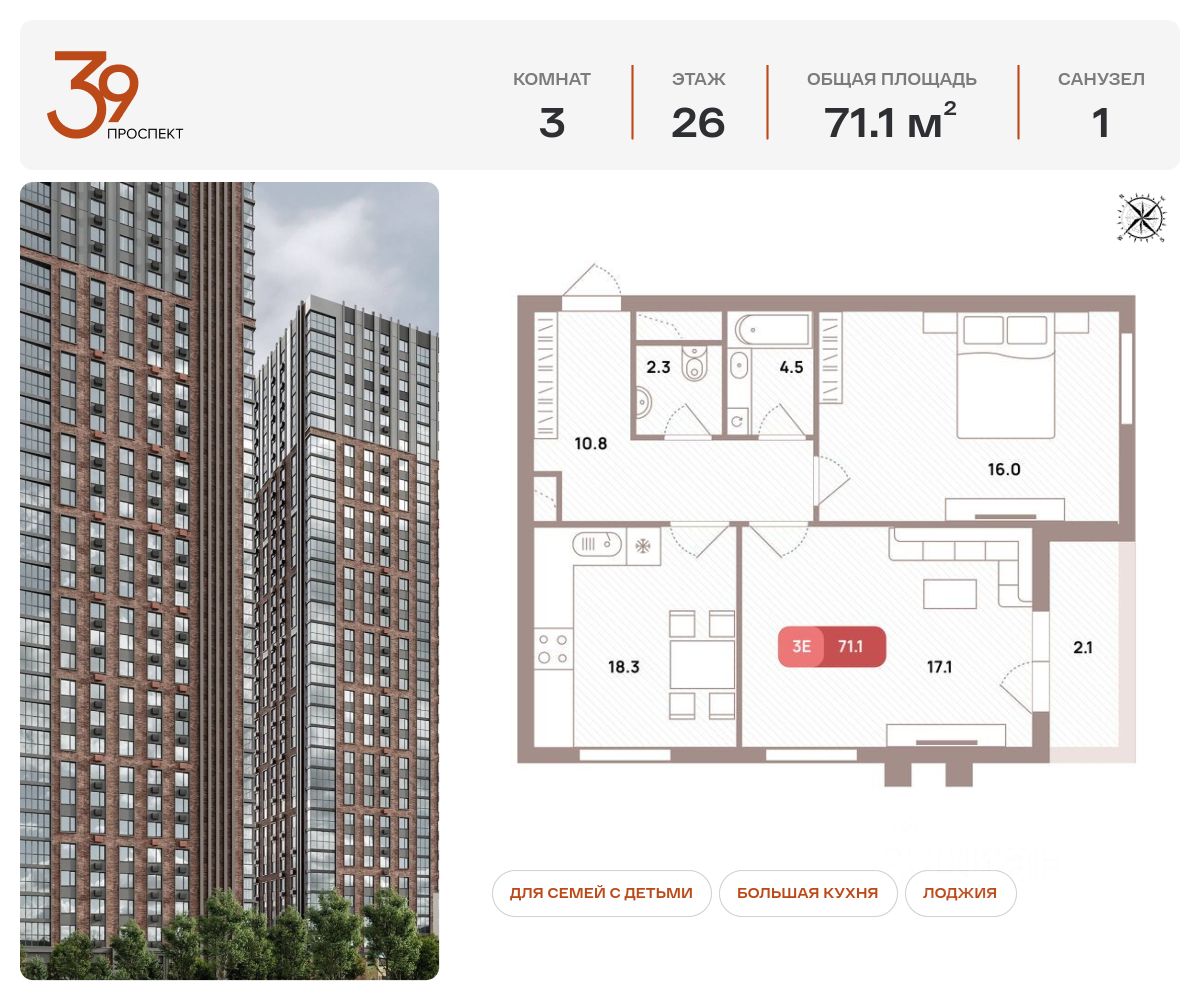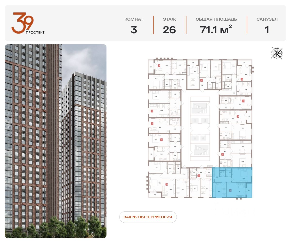 Продается трехкомнатная квартира в ЖК "Проспект 39" по адресу Москва, ЮВАО, Рязанский проспект, вл. 39, к. 2. Общая площадь квартиры - 71,10 кв.м., этаж 26. Стоимость квартиры - 24 452 952 р. Продаётся без отделки.