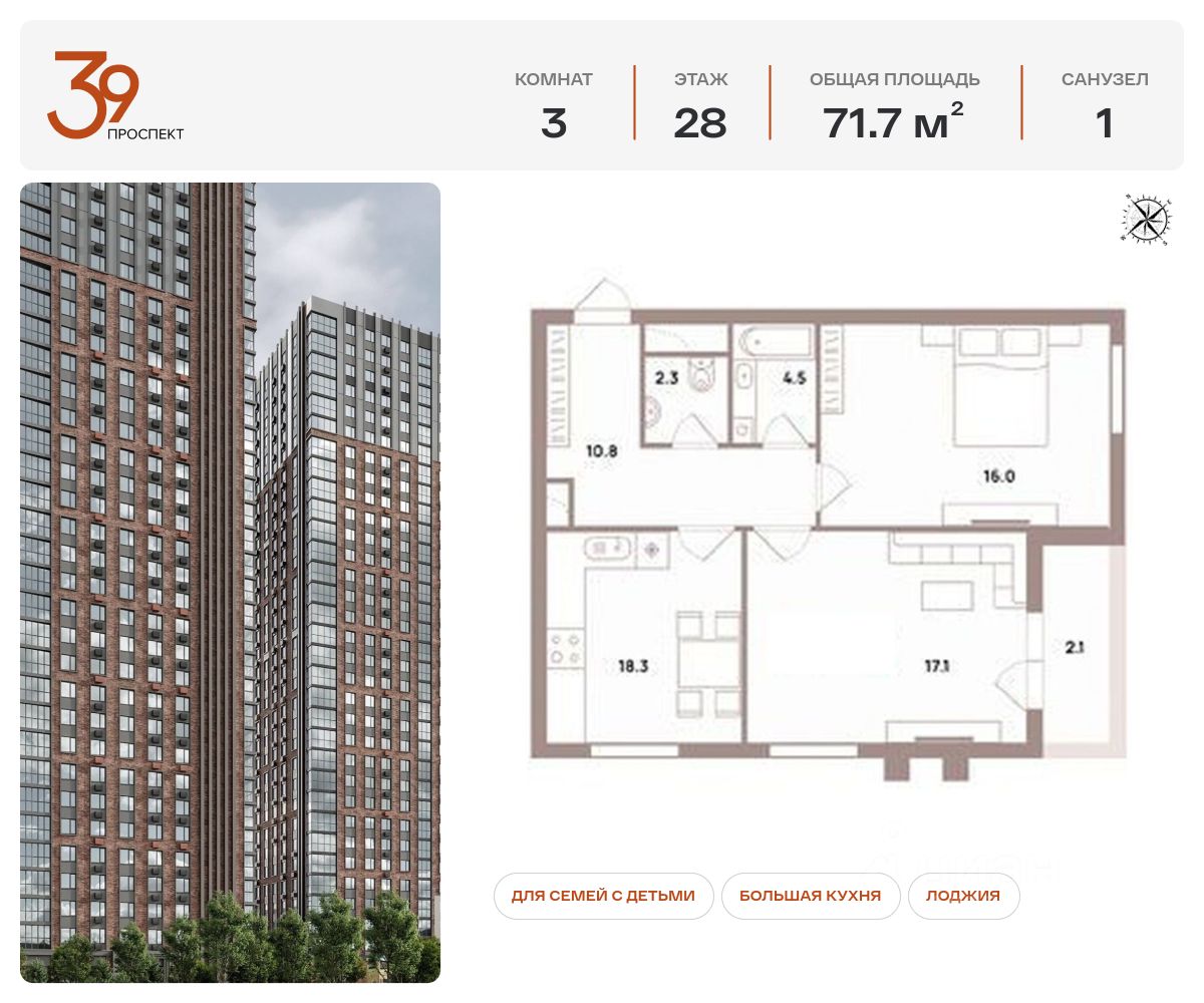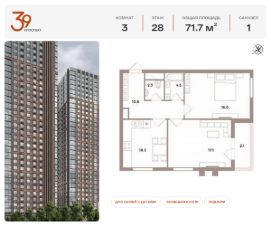 Продается трехкомнатная квартира в ЖК "Проспект 39" по адресу Москва, ЮВАО, Рязанский проспект, вл. 39, к. 2. Общая площадь квартиры - 71,70 кв.м., этаж 28. Стоимость квартиры - 27 215 680 р. Продаётся без отделки.