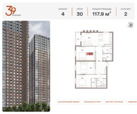 Продается четырехкомнатная квартира в ЖК "Проспект 39" по адресу Москва, ЮВАО, Рязанский проспект, вл. 39, к. 2. Общая площадь квартиры - 117,90 кв.м., этаж 30. Стоимость квартиры - 39 642 399 р. Продаётся без отделки.