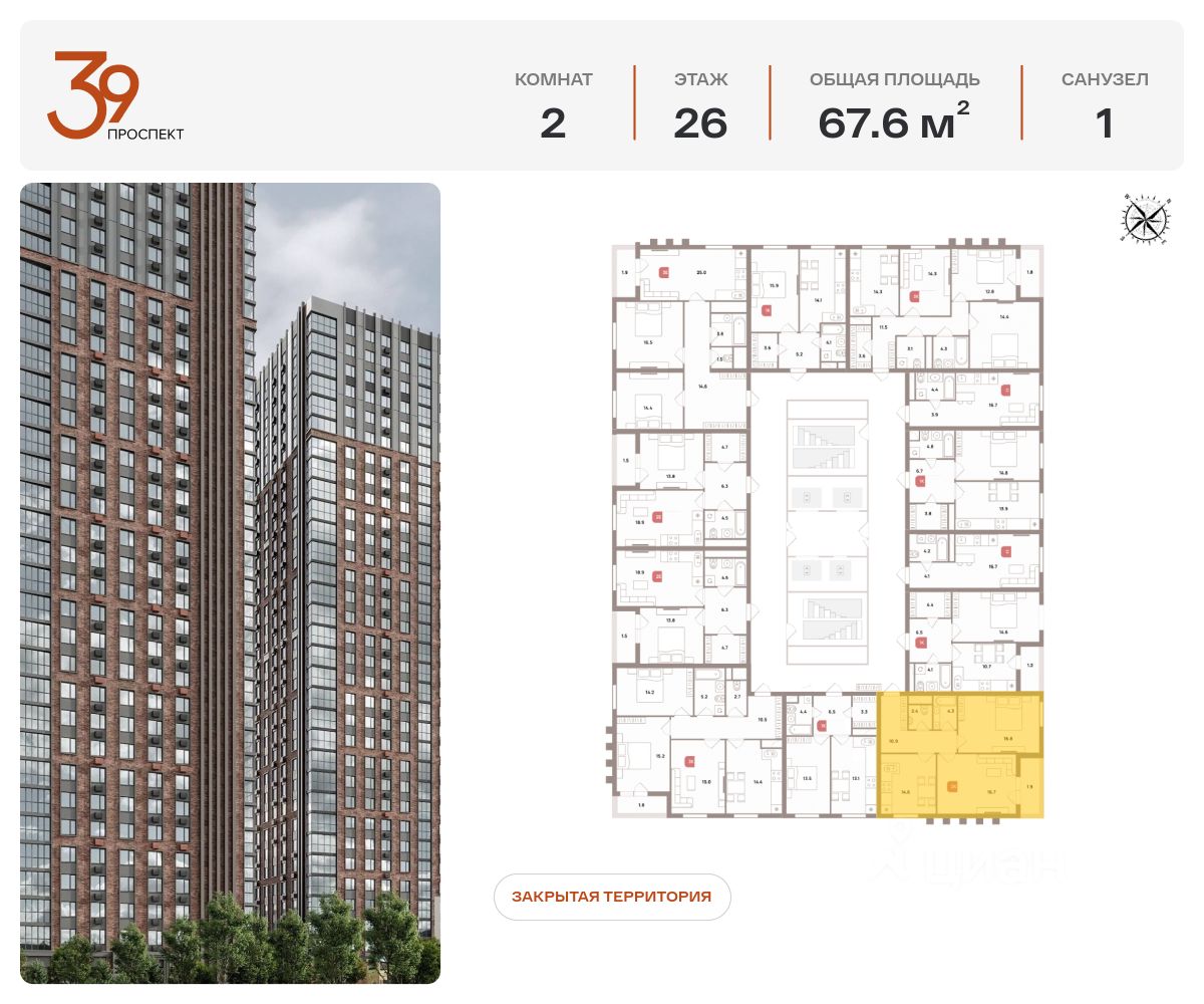 Продается двухкомнатная квартира в ЖК "Проспект 39" по адресу Москва, ЮВАО, Рязанский проспект, вл. 39, к. 1. Общая площадь квартиры - 67,60 кв.м., этаж 26. Стоимость квартиры - 25 852 786 р. Продаётся без отделки.