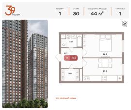 Продается однокомнатная квартира в ЖК "Проспект 39" по адресу Москва, ЮВАО, Рязанский проспект, вл. 39, к. 1. Общая площадь квартиры - 44,00 кв.м., этаж 30. Стоимость квартиры - 18 377 271 р. Продаётся без отделки.
