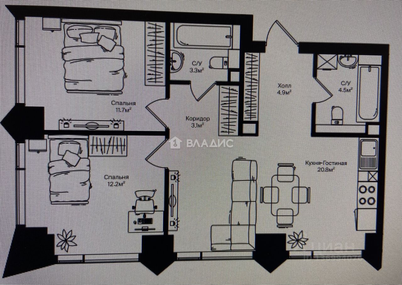 Квартира с чистовой отделкой . Две изолированные спальни и гостиная кухня большая.