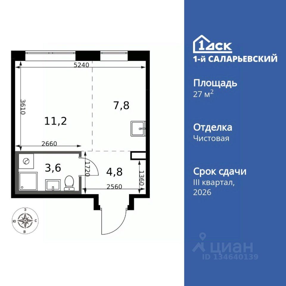 Продаётся квартира-студия номер 126 общей площадью 27.4 кв.м. на 15-м этаже 24 этажного здания. Чистовая отделка. Цена с учётом скидки.