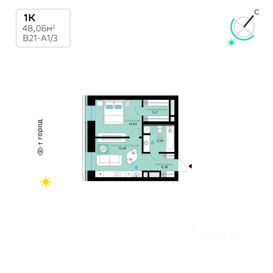 В продаже — однокомнатная квартира с чистовой отделкой, общей площадью 48,06 кв. м. Квартира расположена на втором этаже одинадцатиэтажной секции корпуса класса Адвансд в новом районе СберСити, который строит Сбер. Дом находится на второй береговой линии Москвы-реки.