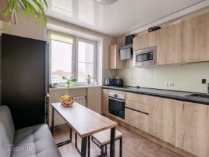 Кухня — удобная и современная, со всей техникой: варочная панель, духовка, посудомойка — всё встроено. Готовить здесь — одно удовольствие.
