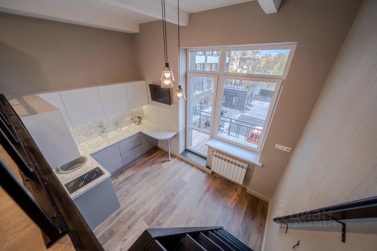 Стильные 2-х-уровневые апартаменты, общей площадью - 21,6 кв. м, Площадь первого этажа составляет 21,6 кв. м., второго этажа - 10 кв. м. Высота потолков 3,5 метра..