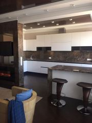 Встроенный кухонный гарнитур под единой столешницей оборудован всей необходимой техникой: электрический духовой шкаф, керамоплита, посудомоечная машина автомат, двухкамерный холодильник. Вся кухня отделана натуральным мрамором.