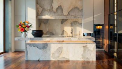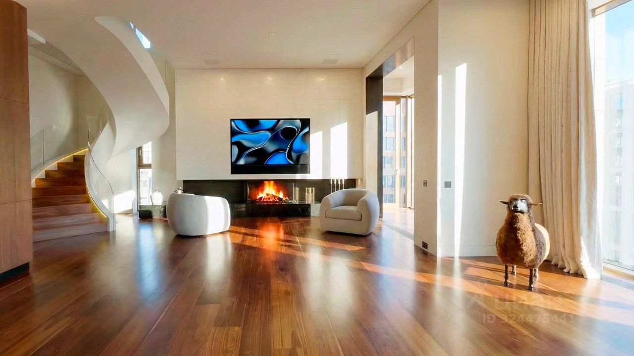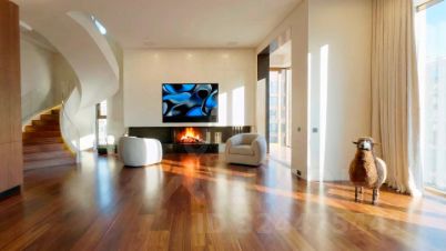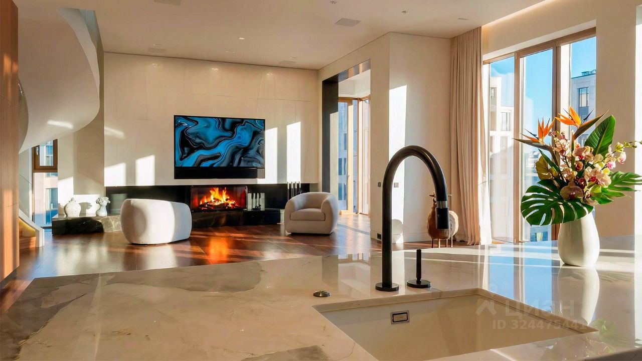 Пентхаус с дизайнерским ремонтом расположен на одиннадцатом этаже. В интерьерах использованы ценные породы дерева и натурального камня. В гостиной установлен дровяной камин. Благодаря панорамным и мансардным окнам пространство наполнено естественным светом.