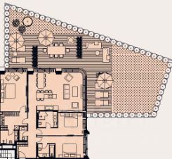 Выход на террасу организован сразу из двух зон: из мастер-спальни и из кухни-гостиной.