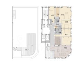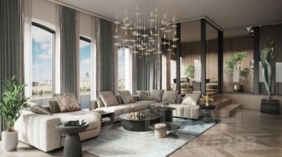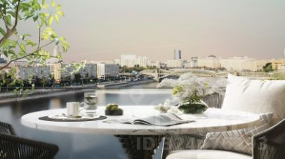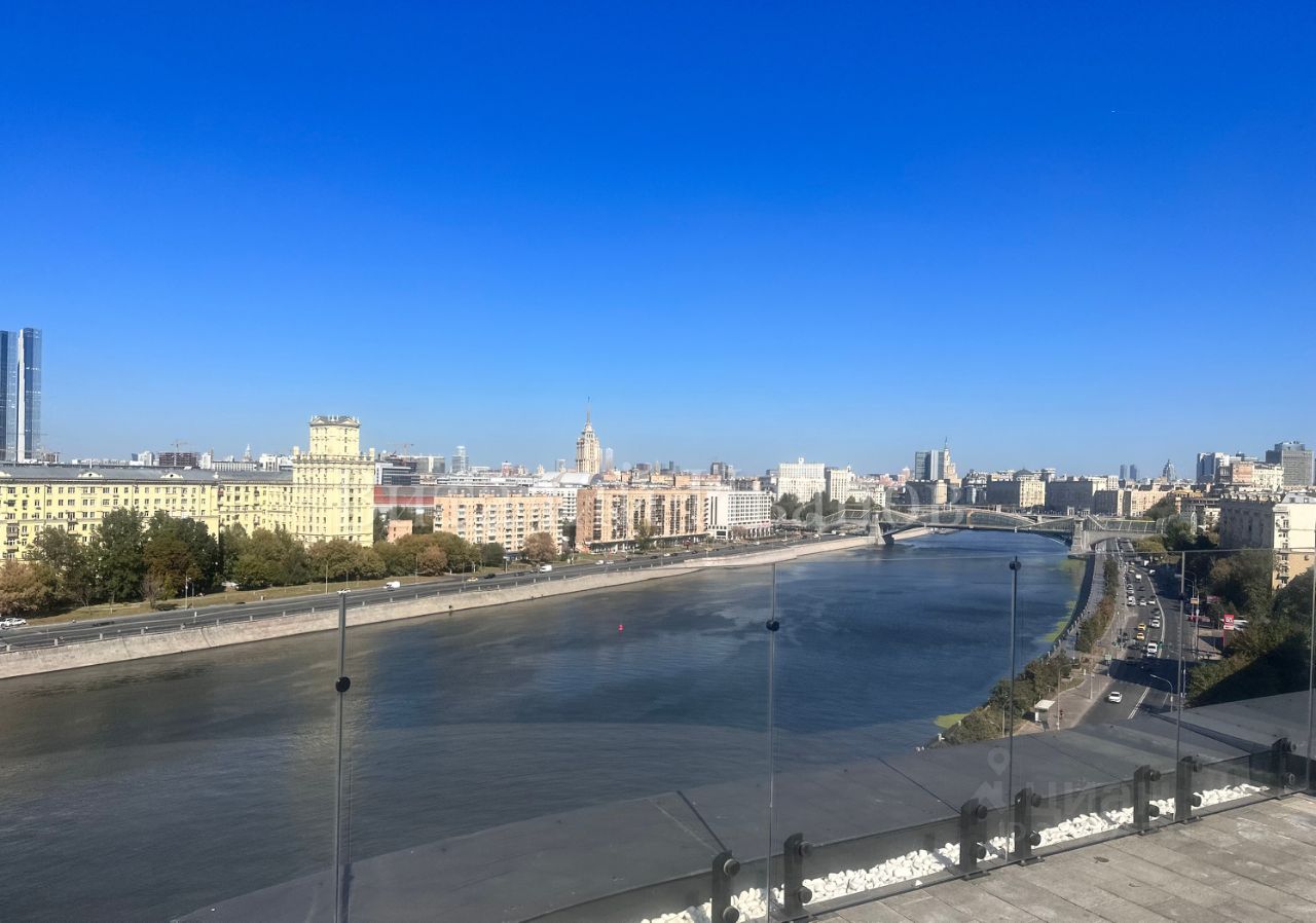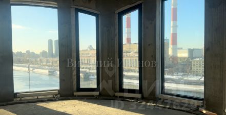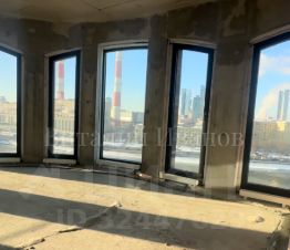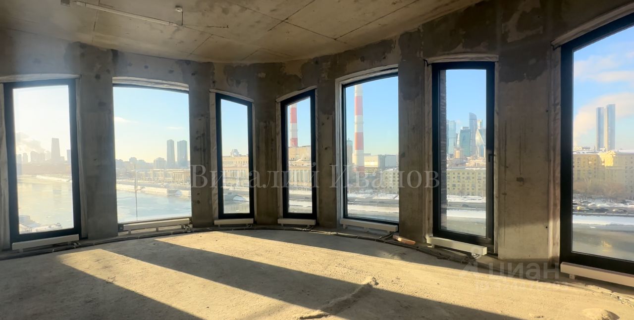 Квартира без отделки общей площадью 260,6 м² расположена на девятом этаже на первой линии набережной Москва-реки.