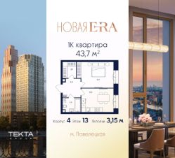 1-комн. квартира в ЖК "Era" на 13 этаже в 43 этажном здании Корпус 4. Общая площадь: 43.7 кв.м., жилая: 16.10 кв.м. Высота потолков 3.15 м.