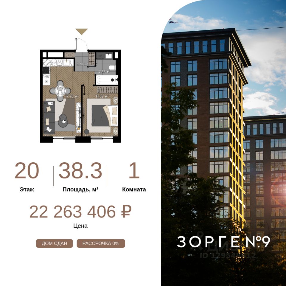 "Зорге 9" — готовые апартаменты бизнес-класса на Ходынке. 10 минут до Москва-Сити. Архитектура: 3 современных корпуса с фасадами в стиле архитектуры Нью-Йорка и с сервисами премиальных отелей, высотой до 23 этажа. Строгие линии, панорамные окна создают ощущение неподдельной роскоши и комфортной жизни в сердце мегаполиса. Проект награжден авторитетной премией European Property Awards. Резиденции: Свободная планировка, небольшая глубина этажа, огромные панорамные окна в пол до 3,6 м и высота потолков до от 3,3 до 4,3 м позволяют реализовать самые смелые концептуальные идеи и создать идеальный интерьер с учетом всех пожеланий. Вдохновляющие виды на город украсят ваш апартамент лучше любой картины. Есть возможность приобретения дизайн-проекта и полной меблировки апартаментов от партнеров девелопера. Расположение: 3 мин. пешком до парка Березовая роща 10 мин. пешком до Ходынского поля 10 мин. до ТЦ Авиапарк 30 минут до Шереметьево 10 мин до Москва-Сити или 1 станция до Москва-Сити 5 минут до ТТК 4 станции метро в шаговой доступности: 6 мин м. Полежаевская (фиолетовая ветка) 7 мин МЦК Зорге (МЦК) 7 мин м. Хорошевская (голубая ветка) 10 мин МЦК Хорошёво (МЦК) Благоустройство: Собственный парк 2 га с амфитеатром и поющими фонтанами. В парке высажено 136 деревьев и более 11 000 кустов и мелких растений из немецких питомников. Площадка для йоги и воркаут-зона со спортивными площадками. Теннисные столы и детский плейхаб Две башни Авторское гранд-лобби В лобби предусмотрена лаундж-зона, чайная с камином, комната для хранения велосипедов и колясок. Доступ по системе FACE ID. В отделке лобби и лифтовых холлов использован декоративный камень итальянского бренда Atlas Concorde Пентхаусы На верхнем уровне комплекса расположены роскошные просторные пентхаусы с высотой потолка до 4,2 метра и панорамными окнами до 3,6 метров, открывающими великолепные виды на столицу. Пентхаусы с выходами на собственные приватные террасы на кровле, площадью от 150 кв. м являются жильем high-уровня, демонстрирующим высокий статус владельца.