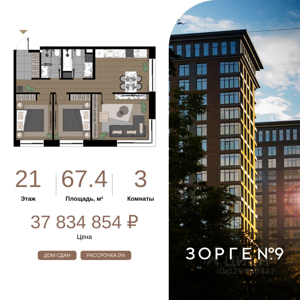 "Зорге 9" — готовые апартаменты бизнес-класса на Ходынке. 10 минут до Москва-Сити. Архитектура: 3 современных корпуса с фасадами в стиле архитектуры Нью-Йорка и с сервисами премиальных отелей, высотой до 23 этажа. Строгие линии, панорамные окна создают ощущение неподдельной роскоши и комфортной жизни в сердце мегаполиса. Проект награжден авторитетной премией European Property Awards. Резиденции: Свободная планировка, небольшая глубина этажа, огромные панорамные окна в пол до 3,6 м и высота потолков до от 3,3 до 4,3 м позволяют реализовать самые смелые концептуальные идеи и создать идеальный интерьер с учетом всех пожеланий. Вдохновляющие виды на город украсят ваш апартамент лучше любой картины. Есть возможность приобретения дизайн-проекта и полной меблировки апартаментов от партнеров девелопера. Расположение: 3 мин. пешком до парка Березовая роща 10 мин. пешком до Ходынского поля 10 мин. до ТЦ Авиапарк 30 минут до Шереметьево 10 мин до Москва-Сити или 1 станция до Москва-Сити 5 минут до ТТК 4 станции метро в шаговой доступности: 6 мин м. Полежаевская (фиолетовая ветка) 7 мин МЦК Зорге (МЦК) 7 мин м. Хорошевская (голубая ветка) 10 мин МЦК Хорошёво (МЦК) Благоустройство: Собственный парк 2 га с амфитеатром и поющими фонтанами. В парке высажено 136 деревьев и более 11 000 кустов и мелких растений из немецких питомников. Площадка для йоги и воркаут-зона со спортивными площадками. Теннисные столы и детский плейхаб Две башни Авторское гранд-лобби В лобби предусмотрена лаундж-зона, чайная с камином, комната для хранения велосипедов и колясок. Доступ по системе FACE ID. В отделке лобби и лифтовых холлов использован декоративный камень итальянского бренда Atlas Concorde Пентхаусы На верхнем уровне комплекса расположены роскошные просторные пентхаусы с высотой потолка до 4,2 метра и панорамными окнами до 3,6 метров, открывающими великолепные виды на столицу. Пентхаусы с выходами на собственные приватные террасы на кровле, площадью от 150 кв. м являются жильем high-уровня, демонстрирующим высокий статус владельца.