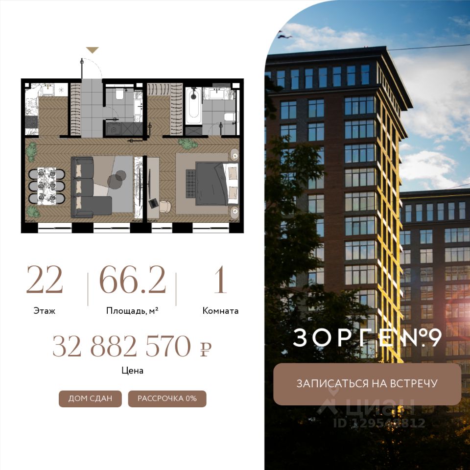 "Зорге 9" — готовые апартаменты бизнес-класса на Ходынке. 10 минут до Москва-Сити. Архитектура: 3 современных корпуса с фасадами в стиле архитектуры Нью-Йорка и с сервисами премиальных отелей, высотой до 23 этажа. Строгие линии, панорамные окна создают ощущение неподдельной роскоши и комфортной жизни в сердце мегаполиса. Проект награжден авторитетной премией European Property Awards. Резиденции: Свободная планировка, небольшая глубина этажа, огромные панорамные окна в пол до 3,6 м и высота потолков до от 3,3 до 4,3 м позволяют реализовать самые смелые концептуальные идеи и создать идеальный интерьер с учетом всех пожеланий. Вдохновляющие виды на город украсят ваш апартамент лучше любой картины. Есть возможность приобретения дизайн-проекта и полной меблировки апартаментов от партнеров девелопера. Расположение: 3 мин. пешком до парка Березовая роща 10 мин. пешком до Ходынского поля 10 мин. до ТЦ Авиапарк 30 минут до Шереметьево 10 мин до Москва-Сити или 1 станция до Москва-Сити 5 минут до ТТК 4 станции метро в шаговой доступности: 6 мин м. Полежаевская (фиолетовая ветка) 7 мин МЦК Зорге (МЦК) 7 мин м. Хорошевская (голубая ветка) 10 мин МЦК Хорошёво (МЦК) Благоустройство: Собственный парк 2 га с амфитеатром и поющими фонтанами. В парке высажено 136 деревьев и более 11 000 кустов и мелких растений из немецких питомников. Площадка для йоги и воркаут-зона со спортивными площадками. Теннисные столы и детский плейхаб Две башни Авторское гранд-лобби В лобби предусмотрена лаундж-зона, чайная с камином, комната для хранения велосипедов и колясок. Доступ по системе FACE ID. В отделке лобби и лифтовых холлов использован декоративный камень итальянского бренда Atlas Concorde Пентхаусы На верхнем уровне комплекса расположены роскошные просторные пентхаусы с высотой потолка до 4,2 метра и панорамными окнами до 3,6 метров, открывающими великолепные виды на столицу. Пентхаусы с выходами на собственные приватные террасы на кровле, площадью от 150 кв. м являются жильем high-уровня, демонстрирующим высокий статус владельца.