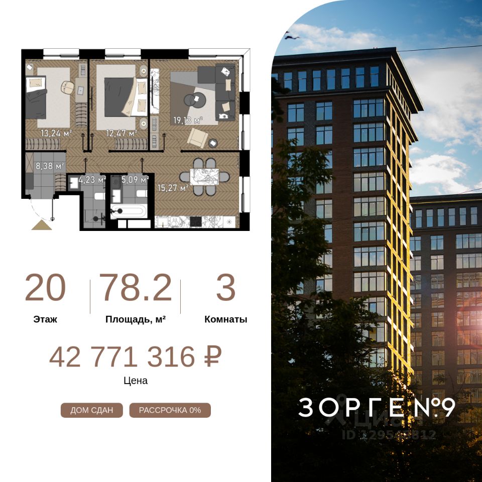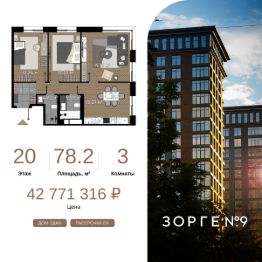 "Зорге 9" — готовые апартаменты бизнес-класса на Ходынке. 10 минут до Москва-Сити. Архитектура: 3 современных корпуса с фасадами в стиле архитектуры Нью-Йорка и с сервисами премиальных отелей, высотой до 23 этажа. Строгие линии, панорамные окна создают ощущение неподдельной роскоши и комфортной жизни в сердце мегаполиса. Проект награжден авторитетной премией European Property Awards. Резиденции: Свободная планировка, небольшая глубина этажа, огромные панорамные окна в пол до 3,6 м и высота потолков до от 3,3 до 4,3 м позволяют реализовать самые смелые концептуальные идеи и создать идеальный интерьер с учетом всех пожеланий. Вдохновляющие виды на город украсят ваш апартамент лучше любой картины. Есть возможность приобретения дизайн-проекта и полной меблировки апартаментов от партнеров девелопера. Расположение: 3 мин. пешком до парка Березовая роща 10 мин. пешком до Ходынского поля 10 мин. до ТЦ Авиапарк 30 минут до Шереметьево 10 мин до Москва-Сити или 1 станция до Москва-Сити 5 минут до ТТК 4 станции метро в шаговой доступности: 6 мин м. Полежаевская (фиолетовая ветка) 7 мин МЦК Зорге (МЦК) 7 мин м. Хорошевская (голубая ветка) 10 мин МЦК Хорошёво (МЦК) Благоустройство: Собственный парк 2 га с амфитеатром и поющими фонтанами. В парке высажено 136 деревьев и более 11 000 кустов и мелких растений из немецких питомников. Площадка для йоги и воркаут-зона со спортивными площадками. Теннисные столы и детский плейхаб Две башни Авторское гранд-лобби В лобби предусмотрена лаундж-зона, чайная с камином, комната для хранения велосипедов и колясок. Доступ по системе FACE ID. В отделке лобби и лифтовых холлов использован декоративный камень итальянского бренда Atlas Concorde Пентхаусы На верхнем уровне комплекса расположены роскошные просторные пентхаусы с высотой потолка до 4,2 метра и панорамными окнами до 3,6 метров, открывающими великолепные виды на столицу. Пентхаусы с выходами на собственные приватные террасы на кровле, площадью от 150 кв. м являются жильем high-уровня, демонстрирующим высокий статус владельца.