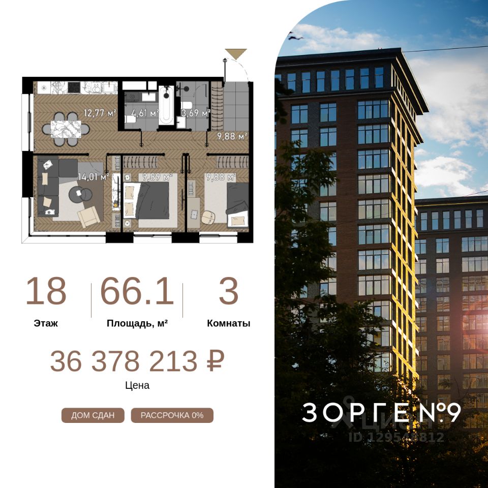 "Зорге 9" — готовые апартаменты бизнес-класса на Ходынке. 10 минут до Москва-Сити. Архитектура: 3 современных корпуса с фасадами в стиле архитектуры Нью-Йорка и с сервисами премиальных отелей, высотой до 23 этажа. Строгие линии, панорамные окна создают ощущение неподдельной роскоши и комфортной жизни в сердце мегаполиса. Проект награжден авторитетной премией European Property Awards. Резиденции: Свободная планировка, небольшая глубина этажа, огромные панорамные окна в пол до 3,6 м и высота потолков до от 3,3 до 4,3 м позволяют реализовать самые смелые концептуальные идеи и создать идеальный интерьер с учетом всех пожеланий. Вдохновляющие виды на город украсят ваш апартамент лучше любой картины. Есть возможность приобретения дизайн-проекта и полной меблировки апартаментов от партнеров девелопера. Расположение: 3 мин. пешком до парка Березовая роща 10 мин. пешком до Ходынского поля 10 мин. до ТЦ Авиапарк 30 минут до Шереметьево 10 мин до Москва-Сити или 1 станция до Москва-Сити 5 минут до ТТК 4 станции метро в шаговой доступности: 6 мин м. Полежаевская (фиолетовая ветка) 7 мин МЦК Зорге (МЦК) 7 мин м. Хорошевская (голубая ветка) 10 мин МЦК Хорошёво (МЦК) Благоустройство: Собственный парк 2 га с амфитеатром и поющими фонтанами. В парке высажено 136 деревьев и более 11 000 кустов и мелких растений из немецких питомников. Площадка для йоги и воркаут-зона со спортивными площадками. Теннисные столы и детский плейхаб Две башни Авторское гранд-лобби В лобби предусмотрена лаундж-зона, чайная с камином, комната для хранения велосипедов и колясок. Доступ по системе FACE ID. В отделке лобби и лифтовых холлов использован декоративный камень итальянского бренда Atlas Concorde Пентхаусы На верхнем уровне комплекса расположены роскошные просторные пентхаусы с высотой потолка до 4,2 метра и панорамными окнами до 3,6 метров, открывающими великолепные виды на столицу. Пентхаусы с выходами на собственные приватные террасы на кровле, площадью от 150 кв. м являются жильем high-уровня, демонстрирующим высокий статус владельца.