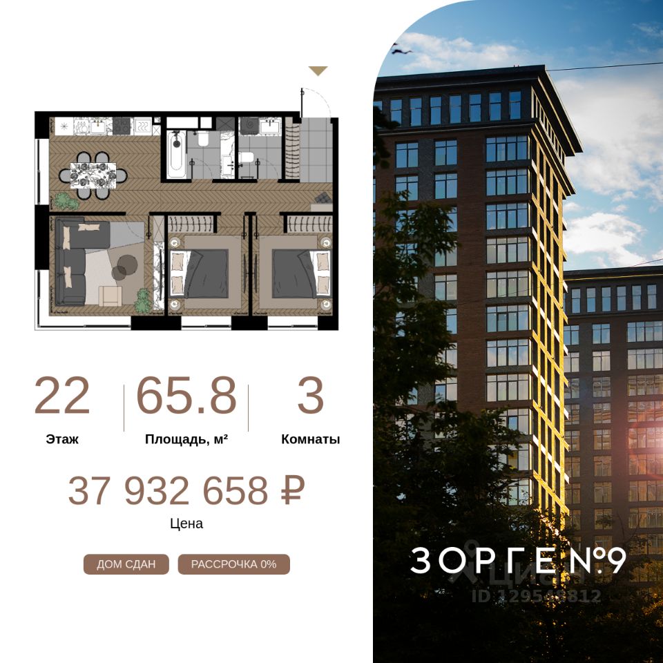 "Зорге 9" — готовые апартаменты бизнес-класса на Ходынке. 10 минут до Москва-Сити. Архитектура: 3 современных корпуса с фасадами в стиле архитектуры Нью-Йорка и с сервисами премиальных отелей, высотой до 23 этажа. Строгие линии, панорамные окна создают ощущение неподдельной роскоши и комфортной жизни в сердце мегаполиса. Проект награжден авторитетной премией European Property Awards. Резиденции: Свободная планировка, небольшая глубина этажа, огромные панорамные окна в пол до 3,6 м и высота потолков до от 3,3 до 4,3 м позволяют реализовать самые смелые концептуальные идеи и создать идеальный интерьер с учетом всех пожеланий. Вдохновляющие виды на город украсят ваш апартамент лучше любой картины. Есть возможность приобретения дизайн-проекта и полной меблировки апартаментов от партнеров девелопера. Расположение: 3 мин. пешком до парка Березовая роща 10 мин. пешком до Ходынского поля 10 мин. до ТЦ Авиапарк 30 минут до Шереметьево 10 мин до Москва-Сити или 1 станция до Москва-Сити 5 минут до ТТК 4 станции метро в шаговой доступности: 6 мин м. Полежаевская (фиолетовая ветка) 7 мин МЦК Зорге (МЦК) 7 мин м. Хорошевская (голубая ветка) 10 мин МЦК Хорошёво (МЦК) Благоустройство: Собственный парк 2 га с амфитеатром и поющими фонтанами. В парке высажено 136 деревьев и более 11 000 кустов и мелких растений из немецких питомников. Площадка для йоги и воркаут-зона со спортивными площадками. Теннисные столы и детский плейхаб Две башни Авторское гранд-лобби В лобби предусмотрена лаундж-зона, чайная с камином, комната для хранения велосипедов и колясок. Доступ по системе FACE ID. В отделке лобби и лифтовых холлов использован декоративный камень итальянского бренда Atlas Concorde Пентхаусы На верхнем уровне комплекса расположены роскошные просторные пентхаусы с высотой потолка до 4,2 метра и панорамными окнами до 3,6 метров, открывающими великолепные виды на столицу. Пентхаусы с выходами на собственные приватные террасы на кровле, площадью от 150 кв. м являются жильем high-уровня, демонстрирующим высокий статус владельца.