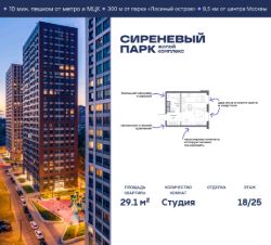 Продаётся просторная студия общей площадью 29.1 м² на 18 этаже в новом жилом комплексе "Сиреневый парк", расположенном в Восточном административном округе Москвы на улице Тагильская. Всего 10 минут ходьбы от станции метро "Бульвар Рокоссовского" и одноимённой платформы МЦК.