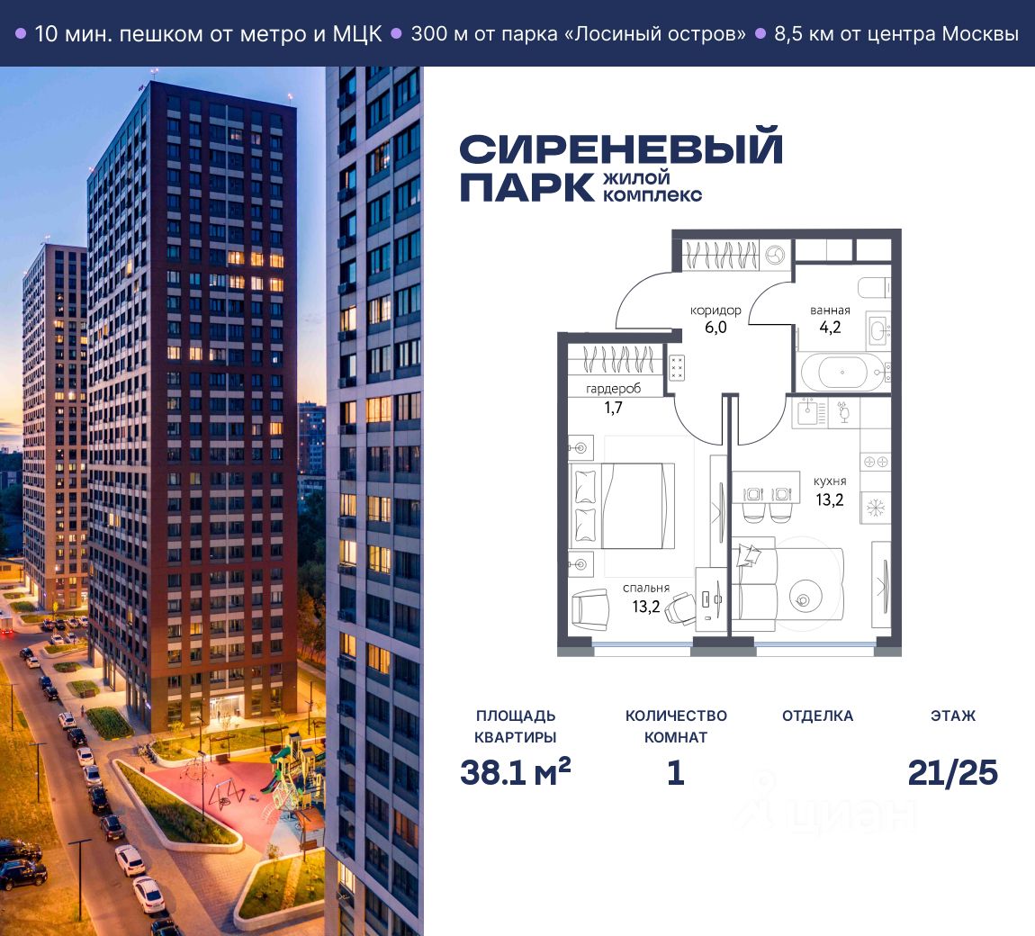 Продаётся просторная 1-комнатная квартира общей площадью 38.1 м² на 21 этаже в новом жилом комплексе "Сиреневый парк", расположенном в Восточном административном округе Москвы на улице Тагильская. Всего 10 минут ходьбы от станции метро "Бульвар Рокоссовского" и одноимённой платформы МЦК.