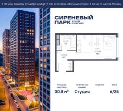 Продаётся просторная студия общей площадью 30.8 м² на 6 этаже в новом жилом комплексе "Сиреневый парк", расположенном в Восточном административном округе Москвы на улице Тагильская. Всего 10 минут ходьбы от станции метро "Бульвар Рокоссовского" и одноимённой платформы МЦК.