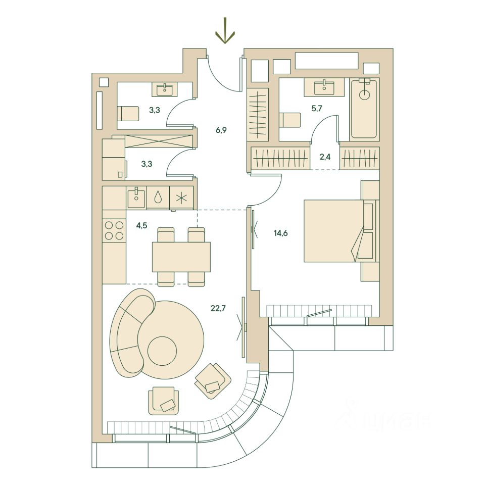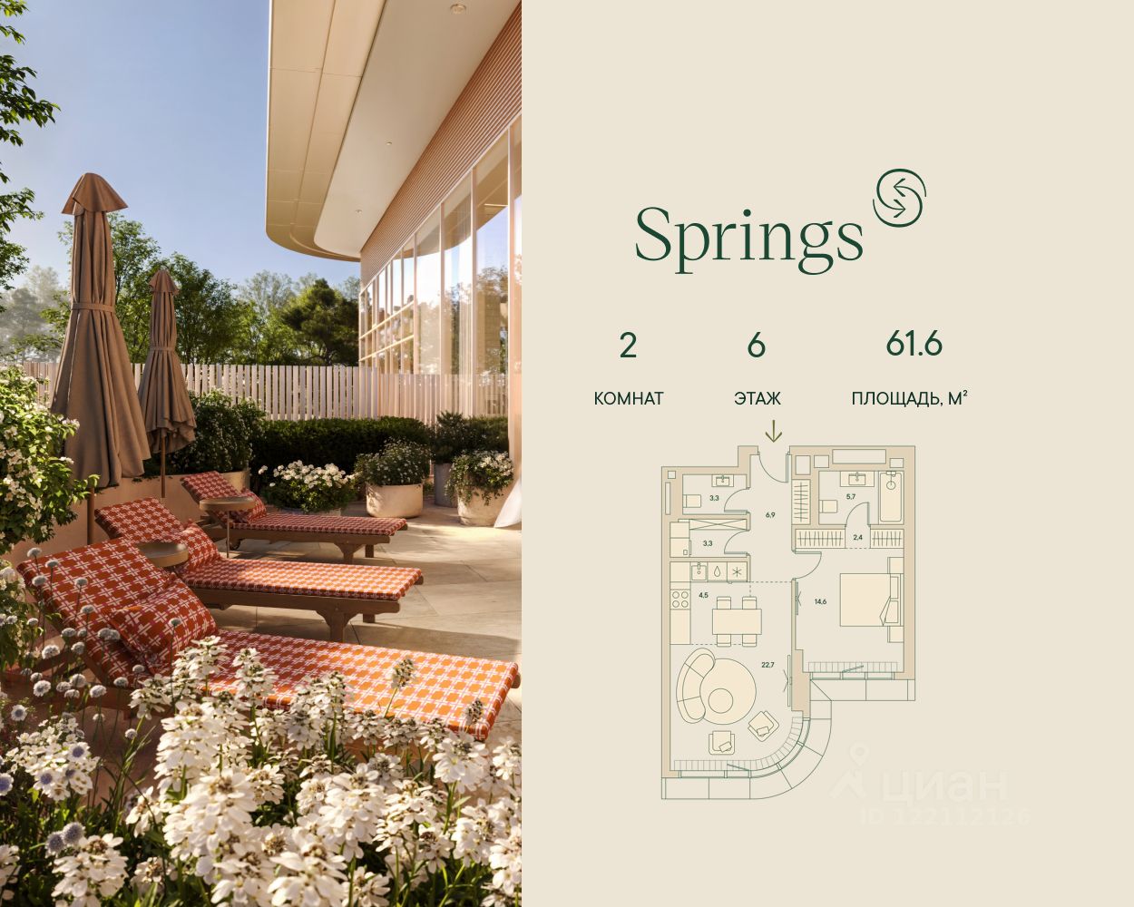 Двухкомнатная wellness-резиденция площадью 61.6 кв. м. на 6 этаже с видом на двор в доме премиум-класса Springs.