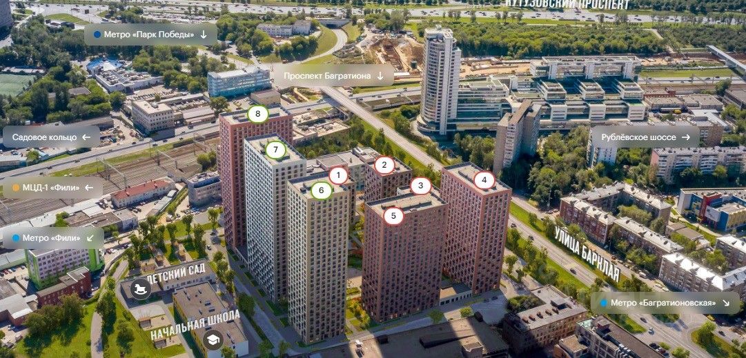 ЖК Барклая 6 состоит из восьми жилых домов с переменной этажностью. ЖК включает подземный паркинг, детский сад на 125 мест и начальную школу на 225 мест. В просторных лобби предусмотрены удобные зоны ожидания, гостевые туалетные комнаты и лапомойки для собак. В квартале создана безбарьерная среда просторный двор без машин с детскими и спортивными площадками и зонами отдыха, вход в подъезды на уровне земли, на первых этажах магазины, кафе и предприятия обслуживания. До метро Багратионовская от Корпуса 6 всего 8 минут пешком, станции метро Парк Победы и Фили также в пешей доступности. Рядом набережная Москвы-реки и Филевский парк, торговый центр Филион и другие крупные ТЦ, включая знаменитую Горбушку. В районе имеются поликлиники, спортивные школы и дворец водных видов спорта Фили.
