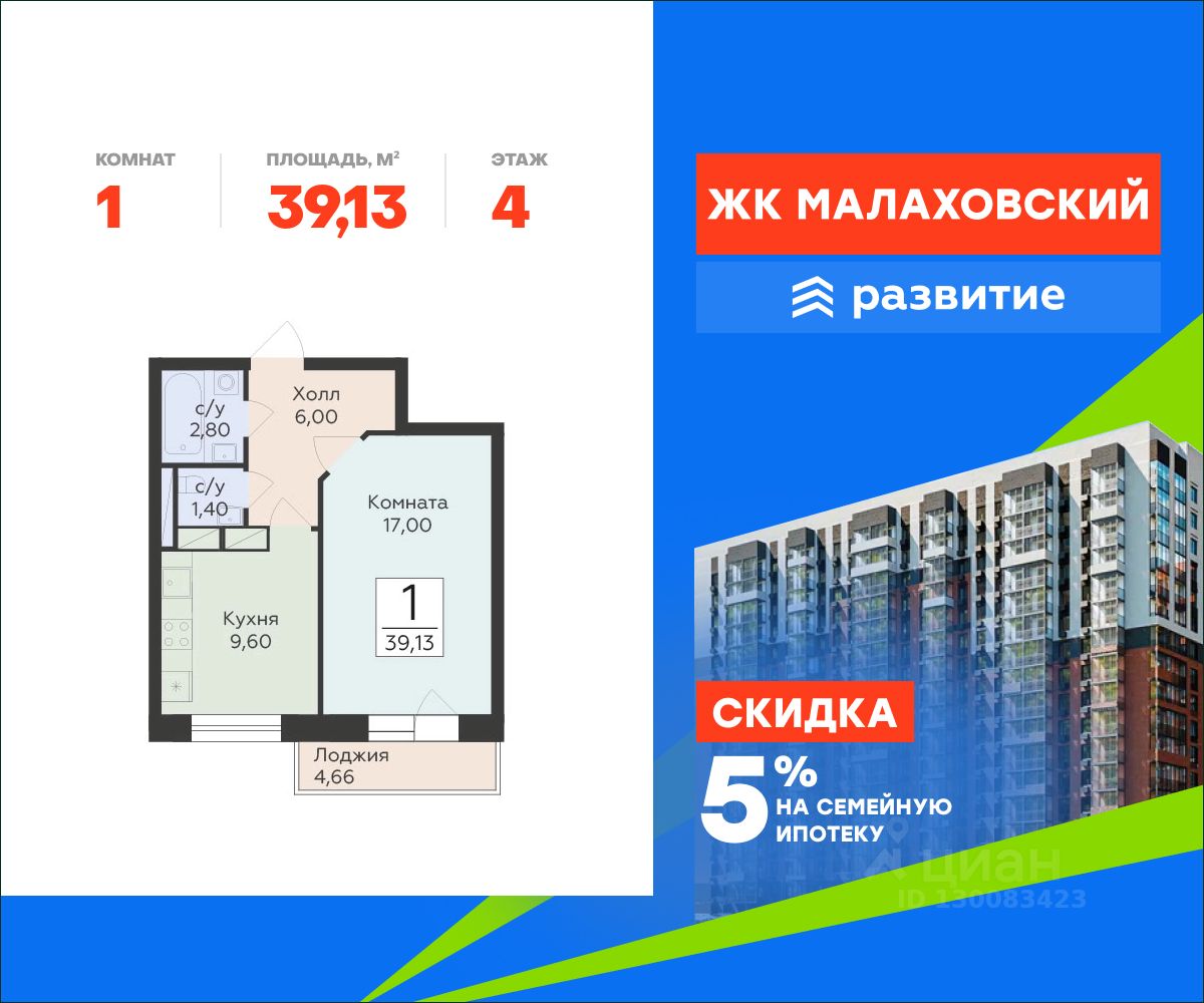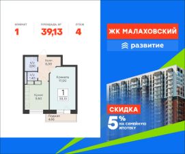 Продается 1-комнатная квартира площадью 39.13 с отделкой White box. Квартира расположена на 4 этаже 17 этажного дома, в 202 корпусе.