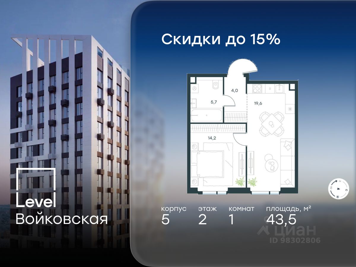 Продается 1-комнатная квартира площадью 43.50 кв. м без отделки. Квартира находится на 2 этаже 20-этажного корпуса 5, в новом жилом комплексе бизнес-класса Level Войковская, расположенном рядом с живописным заповедником "Покровское-Стрешнево" (застройщик - компания Level Group/Левел групп).