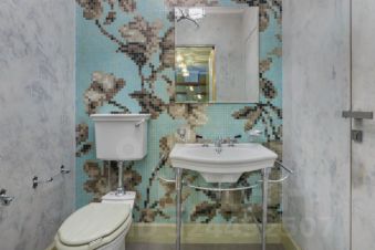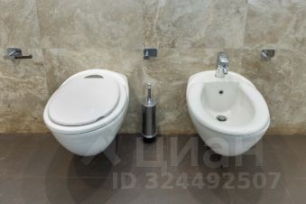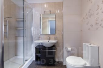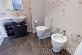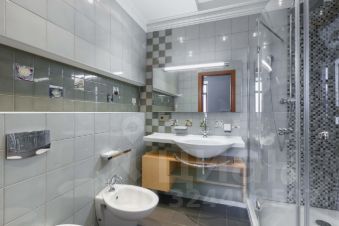 Санузел (4,43 кв.м) Отделка плитка в светлых тонах. Унитаз, раковина, биде, душевая