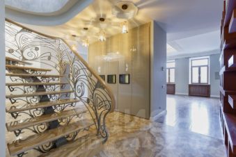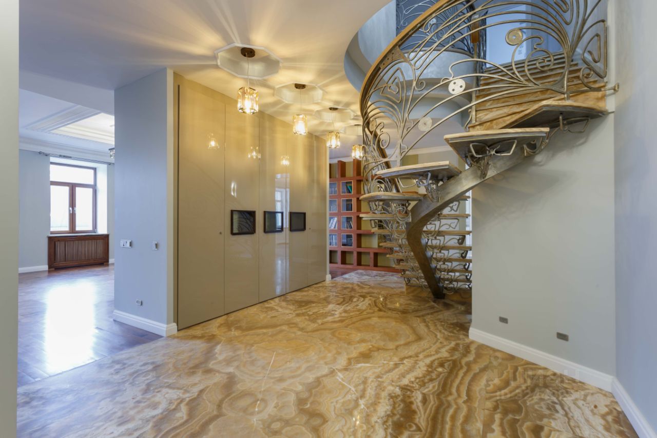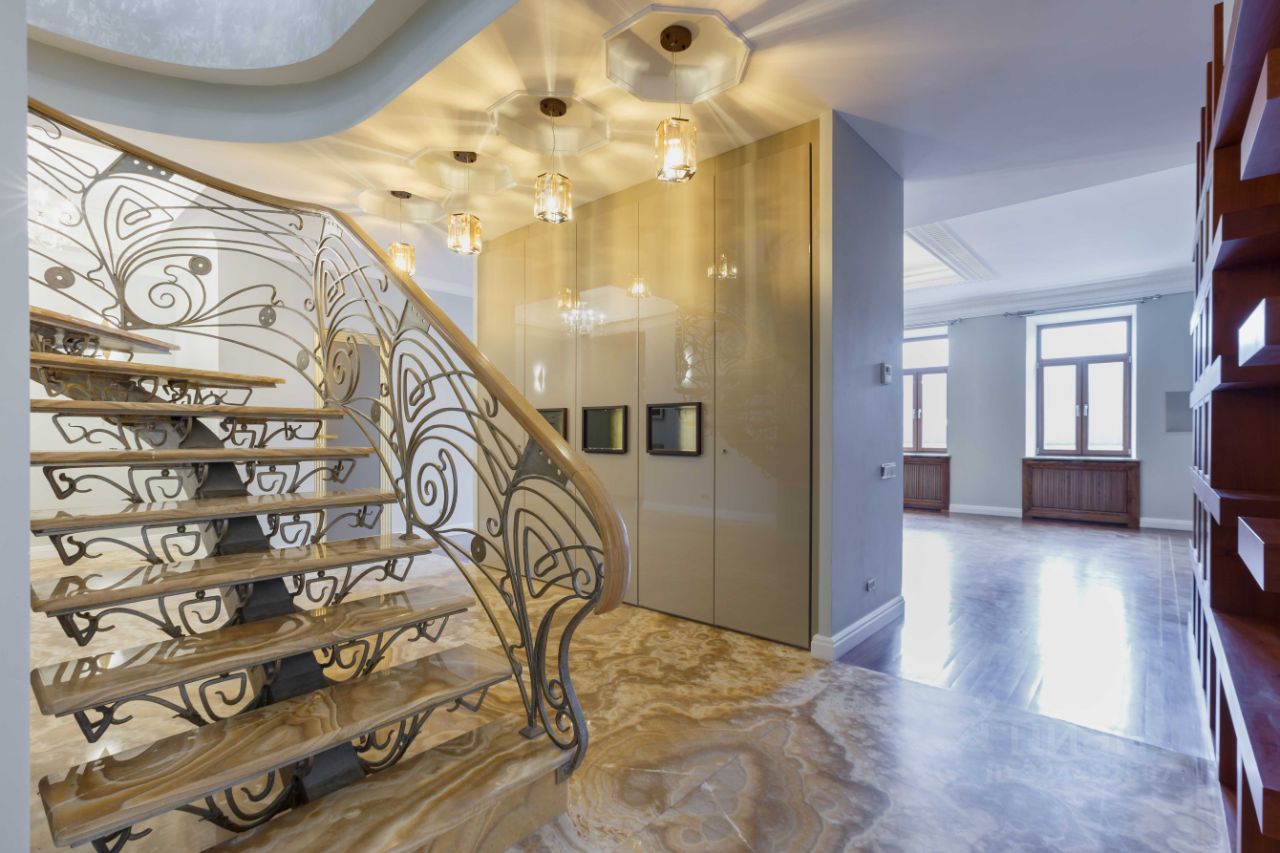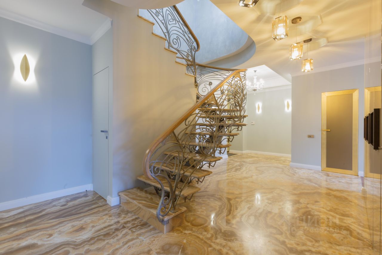 Из Холла на второй этаж идет кованная лестница со ступенями из натурального оникса.
