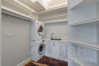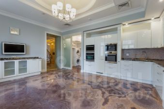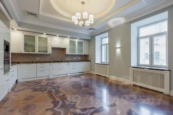 Кухня (27,67 кв.м) с двумя большими окнами во двор на парковку. Вход в прачечную (5,06 кв.м). Напольное покрытие - натуральный оникс. Стены - окрашены. Потолок многоуровневый с лепниной. Кухонный гарнитур SCAVOLINI коллекция BACCARAT (белый лак) с столешницей из натурального камня и аналогичными подоконниками (полный комплект встроенной бытовой техники Kupperbusch).