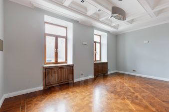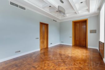 Гостиная (45,95 кв.м) с тремя большими окнами, многоуровневым потолком с лепниной, переходящая в кабинет (21,89 кв.м), спальню (15,23 кв.м) и санузел (4,43 кв.м).