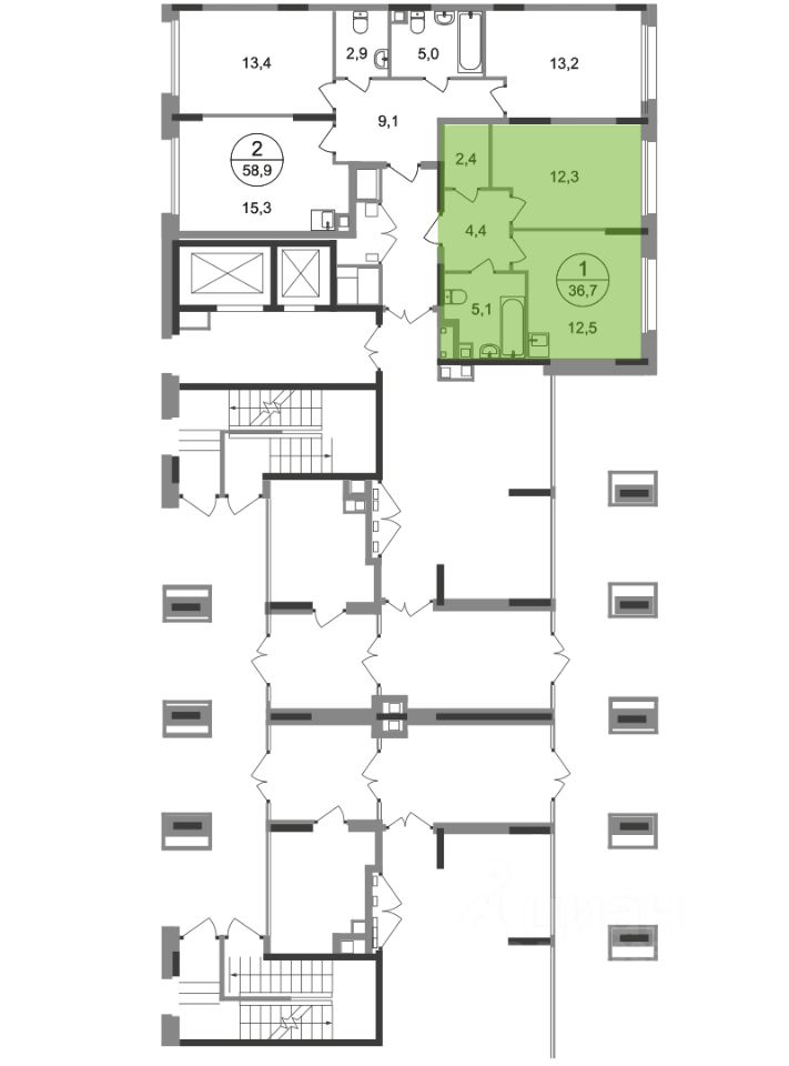 - в секциях 2-4, 6-7, 11-12 по 2 лифта: 1 пассажирский, 1 грузовой