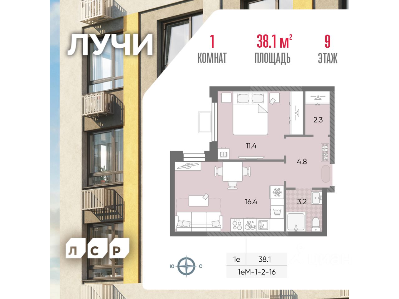 Продается 1-комнатная квартира общей площадью 38.1 кв. метров на 9 этаже жилого комплекса Лучи.