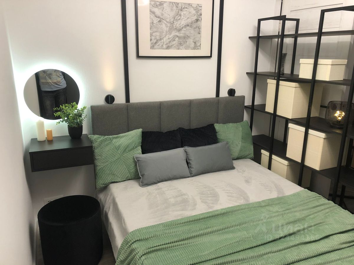 В спальной зоне расположена двуспальная кровать с подъемным механизмом, позволяющим использовать пространство под ней в качестве дополнительной зоны хранения, а также вместительный большой шкаф с полками и рейлингами, выделено место для туалетного столика.