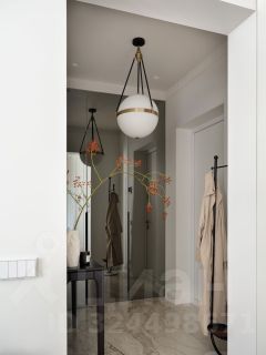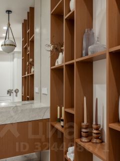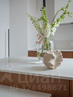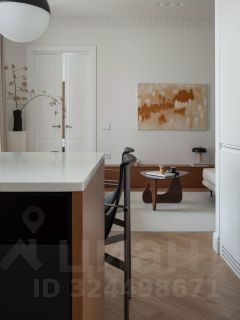 Вся корпусная мебель на заказ, крашеная эмаль и натуральный шпон; на полу в технических зонах итальянская крупноформатная плитка; подоконники и все кухонные поверхности - натуральный камень (кварц); вся техника известных европейских производителей, в гостиной организовано барное хранение, есть винный шкаф.