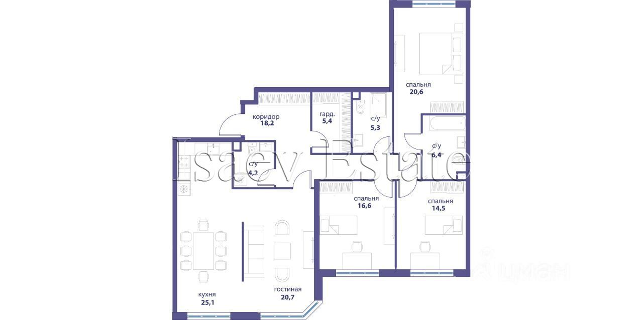 просторную кухню-гостиную, три спальни, одна из которых мастер-спальня, два отдельных сан узла, просторный коридор, предусмотрены гардеробные.