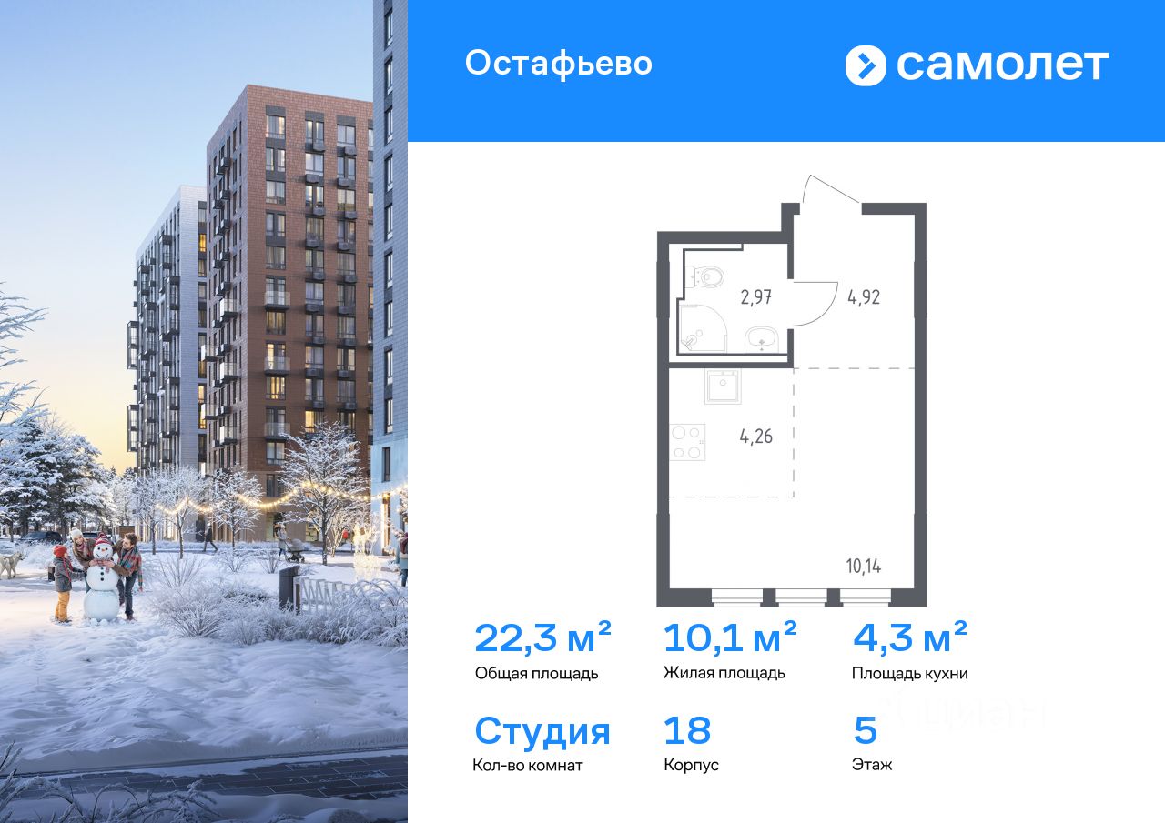 Строим кварталы для жизни с заботой о будущем. Предлагается квартира студия комфорт-класса 22,29 кв.м в корпусе 18 на 5 этаже, в ЖК "Остафьево"