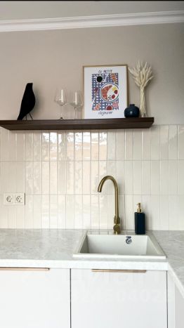 * Кухня оснащена посудомоечной машиной, варочный панелью, духовым шкафом, вытяжкой, холодильником, полностью укомплектованным кухонным гарнитуром, столом и двумя стульями;