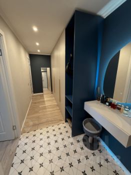 * В коридоре расположены подвесная консоль, современное зеркало с подсветкой, шкафы с огромным количеством места для хранения;