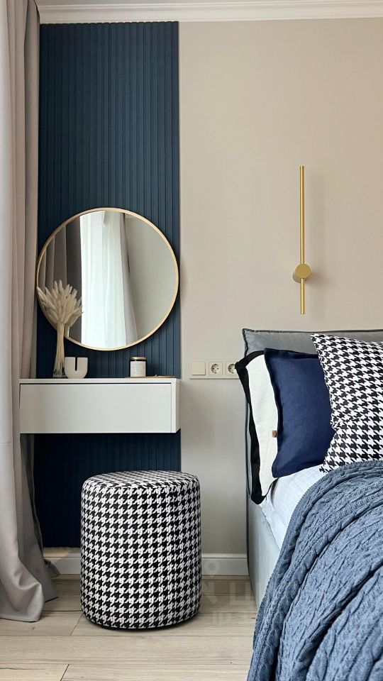 * В спальне установлен кондиционер, останется кровать, зеркало, подвесная консоль, пуф;