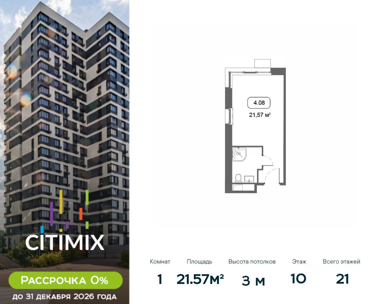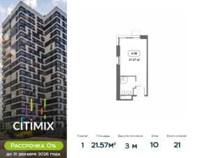 Продаётся студия в корпусе 4, общей площадью 21.57 м², на 10 этаже. Строительство корпуса завершено. Срок ввода — июль 2026 года.