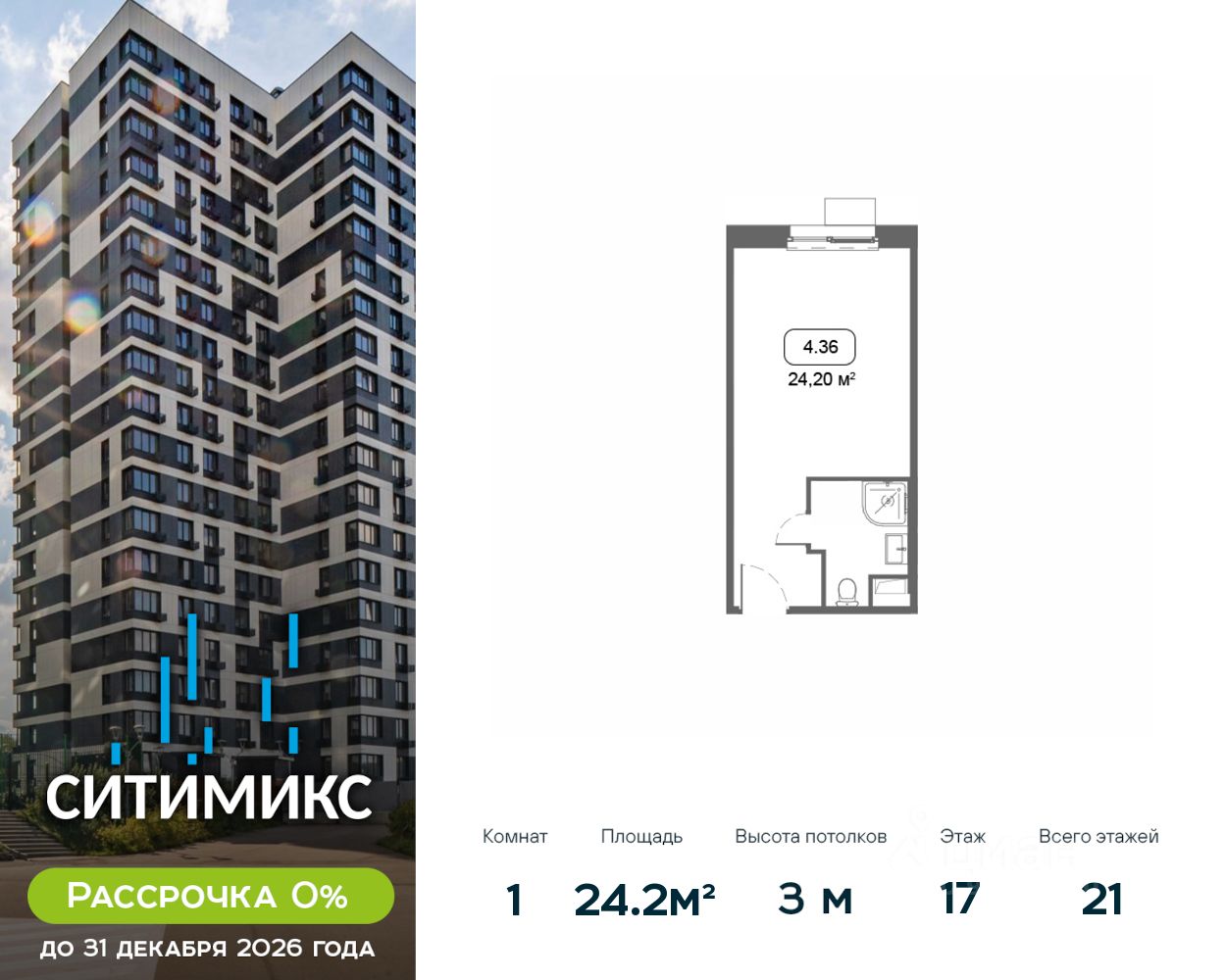 Продаётся студия в корпусе 4, общей площадью 24.2 м², на 17 этаже. Строительство корпуса завершено. Срок ввода — июль 2026 года.