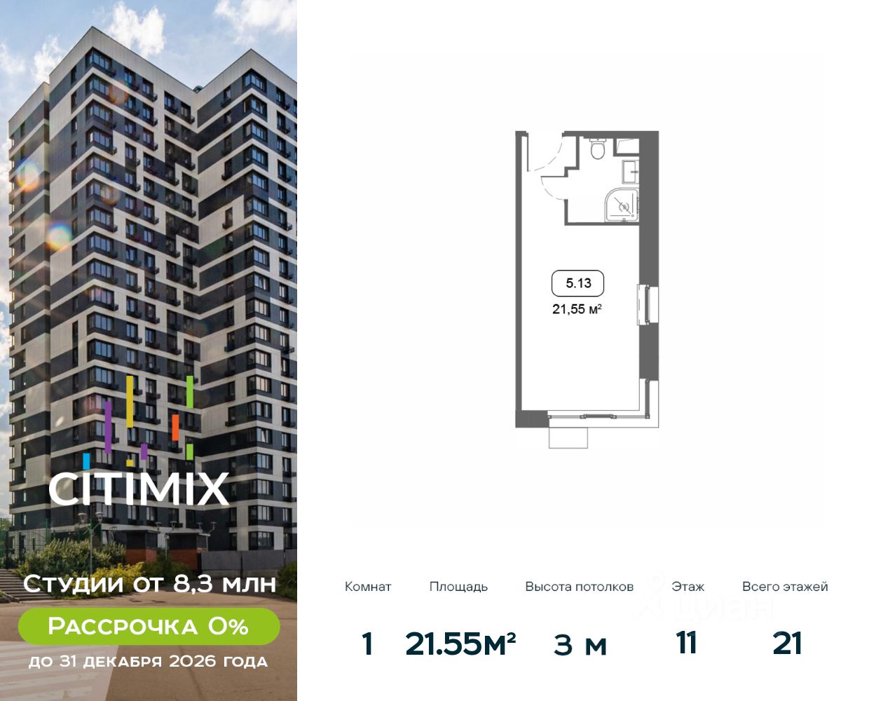 Продаётся студия в строящемся доме (Корпус 5), срок сдачи: III-кв. 2026, общей площадью 21.55 кв.м., на 11 этаже.