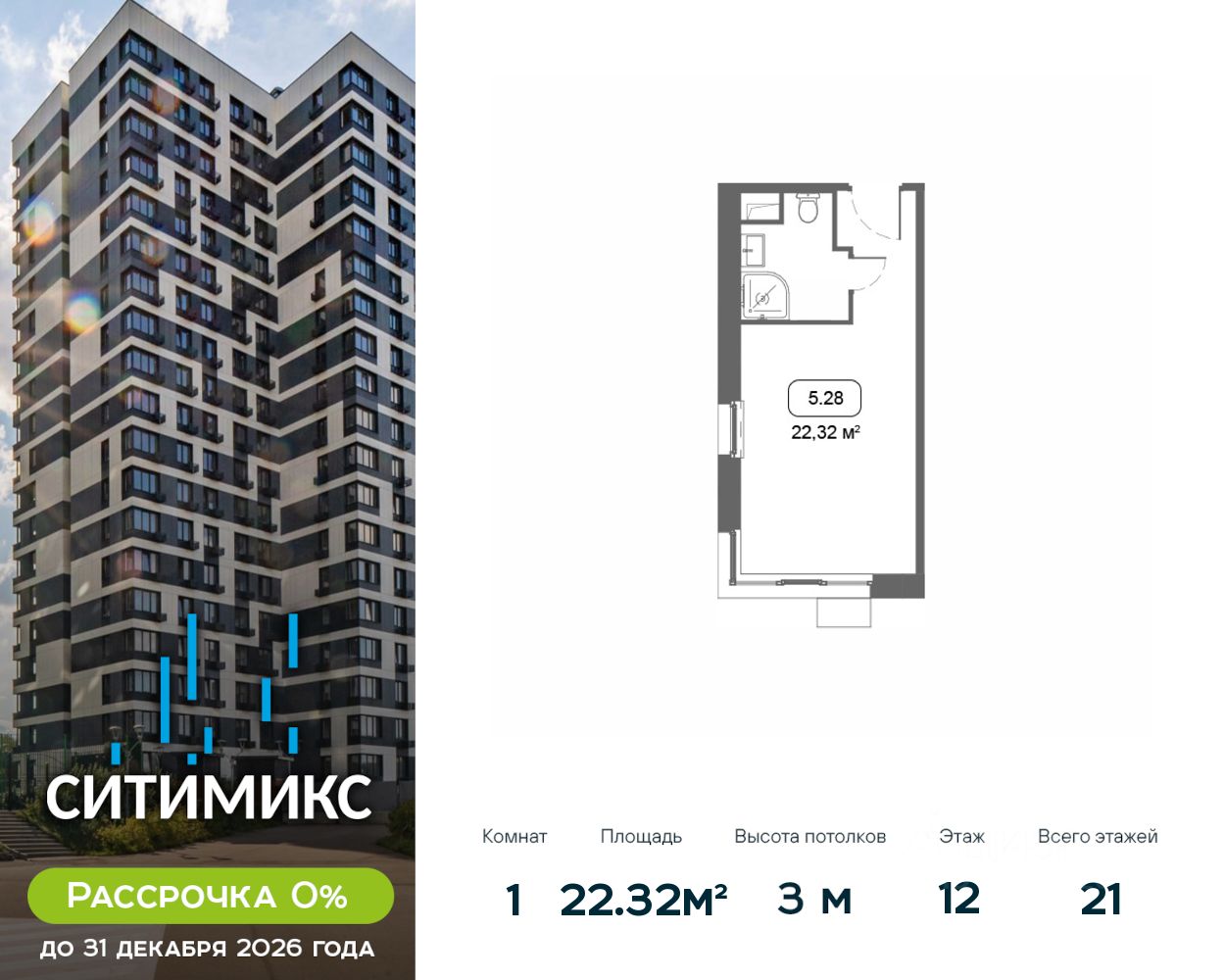 Продаётся студия в корпусе 5, общей площадью 22.32 м², на 12 этаже. Строительство корпуса завершено. Срок ввода — июль 2026 года.