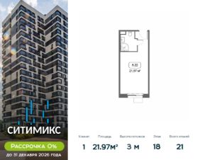 Продаётся студия в корпусе 5, общей площадью 21.97 м², на 18 этаже. Строительство корпуса завершено. Срок ввода — июль 2026 года.